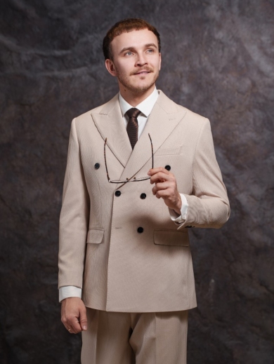 Премиальный дизайн двубортной модели с функциональными карманами на клапанах придает костюму особую респектабельность. Идеальная посадка по фигуре, качественные материалы и продуманный крой обеспечивают комфорт и уверенность в течение всего дня.