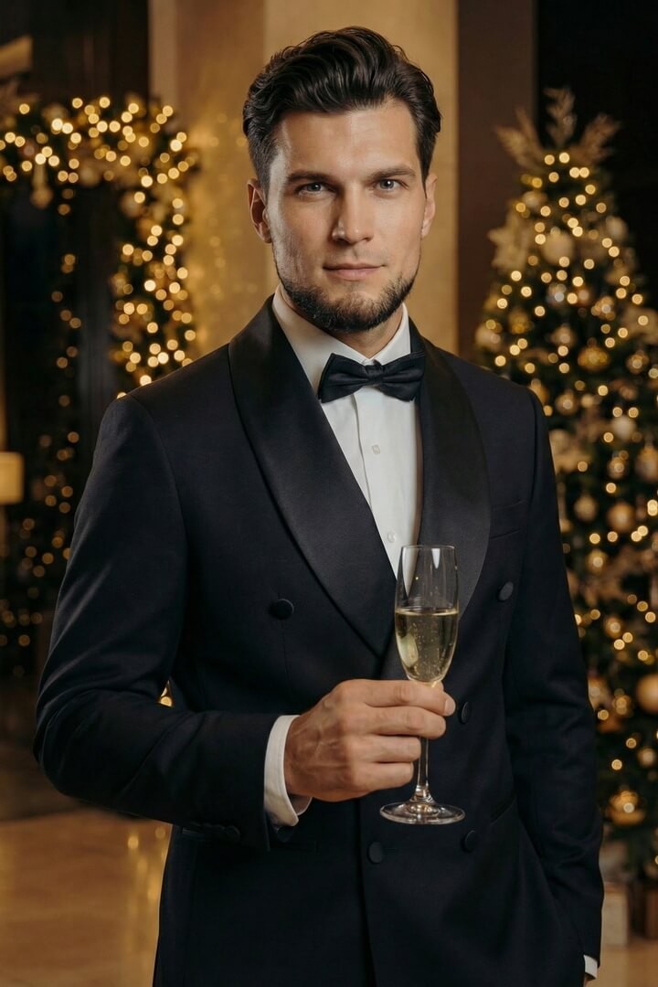 На новогоднем торжестве этот смокинг превратит вас в главного героя вечера.  Вы будете выглядеть одновременно торжественно и непринуждённо — именно так, как должен выглядеть мужчина, знающий цену истинному стилю.
