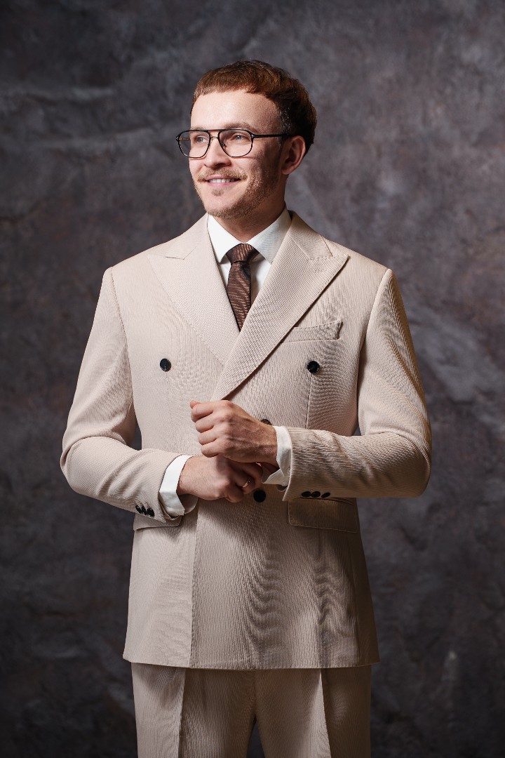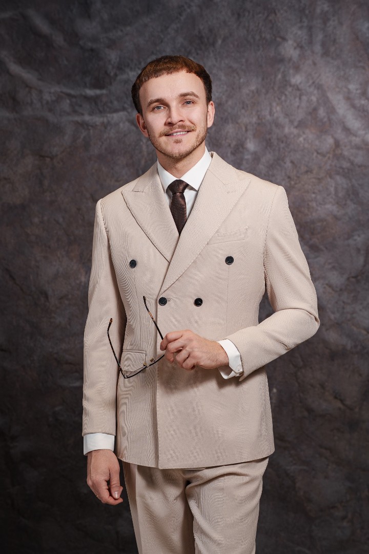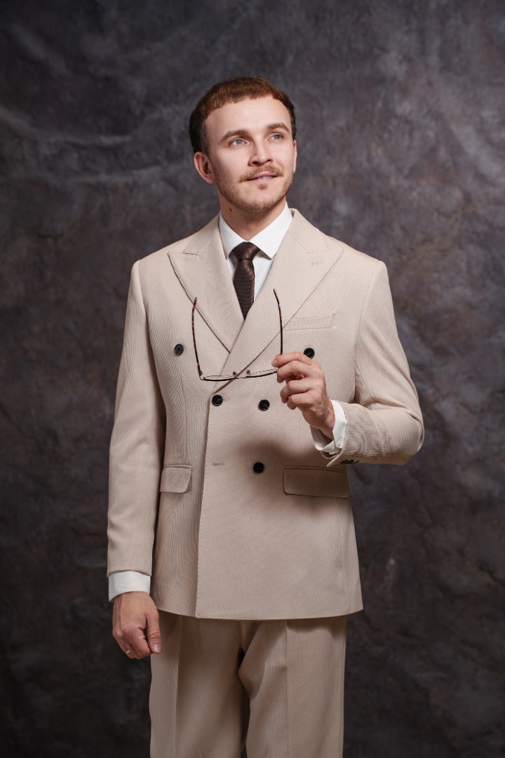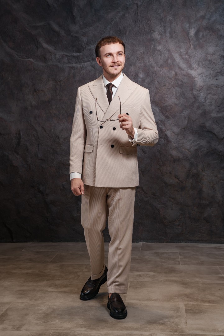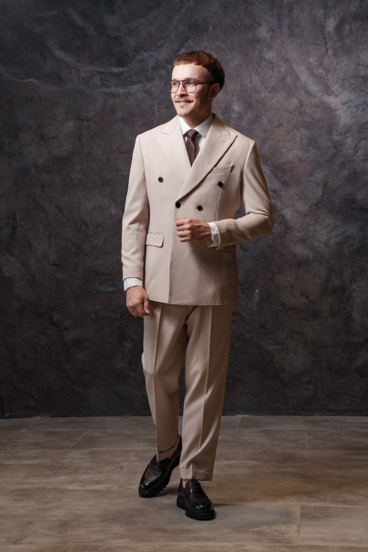 Костюм бежевый двубортный — выбор для тех, кто ценит элегантность и статусность. Двубортный крой подчеркивает стройность силуэта, а мягкий бежевый цвет создает свежий и благородный образ. Классический воротник завершает безупречную геометрию пиджака. Костюм выполнен из качественной ткани. Материал обеспечивает комфорт и воздухообмен в течение дня, отлично держит форму и сохраняет безупречный вид даже после долгой носки. Бежевый оттенок универсален: он одинаково уместен на торжестве, летней свадьбе или деловой встрече. Мужчина в таком костюме подчеркнет отличный вкус и чувство стиля.